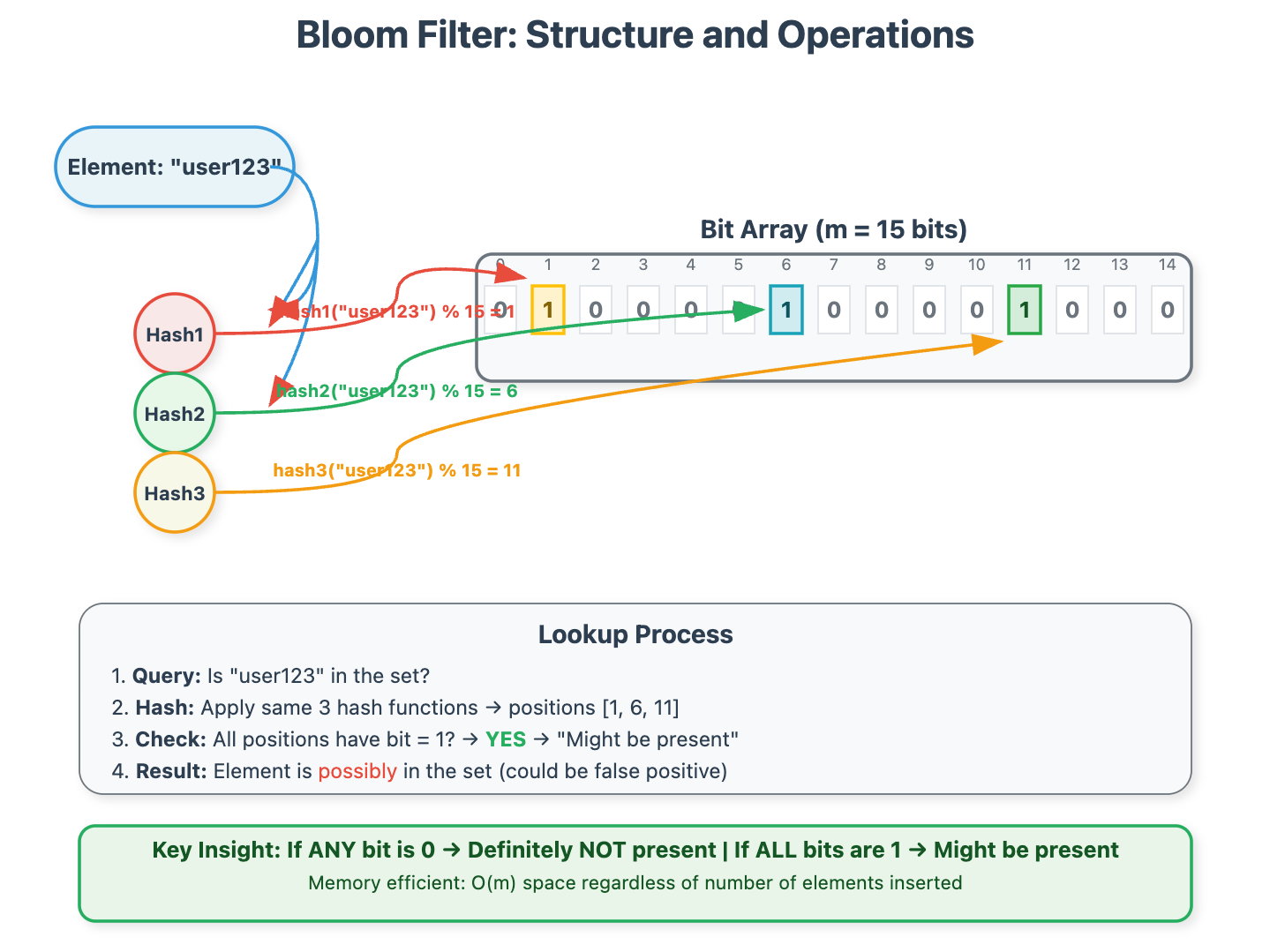 Think of a Bloom filter as making you a very specific promise: "If I say an element isn't here, I'm absolutely certain. If I say it might be here, well... there's a small chance I'm wrong." This asymmetric uncertainty is what makes Bloom filters revolutionary for distributed systems.