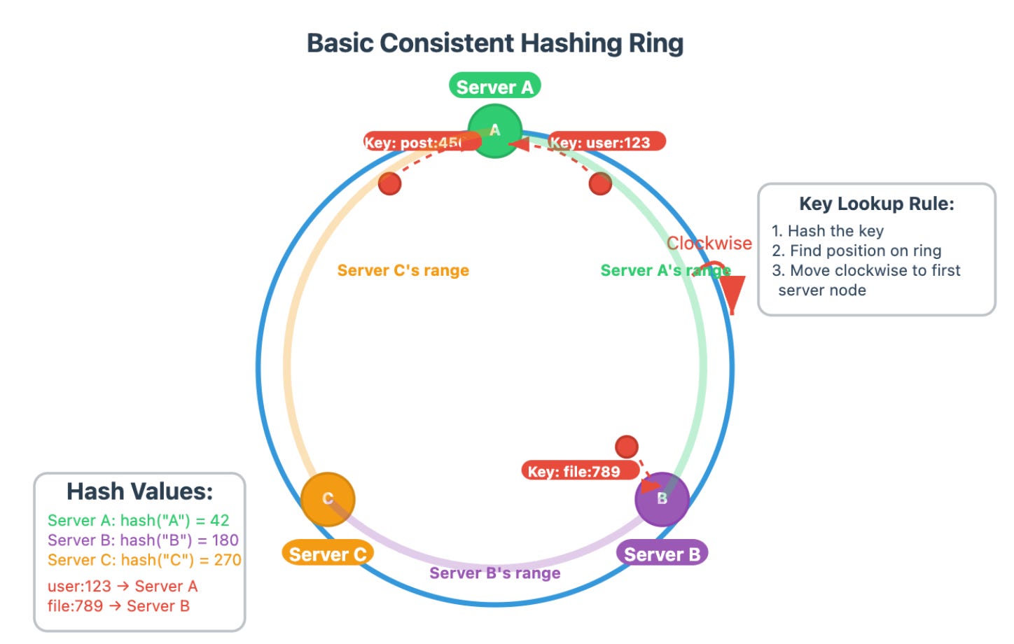 Consistent hashing solves this problem through an elegant conceptual shift: instead of mapping keys directly to servers, it maps both keys and servers to points on a circular hash space, typically a 32-bit or 64-bit ring.