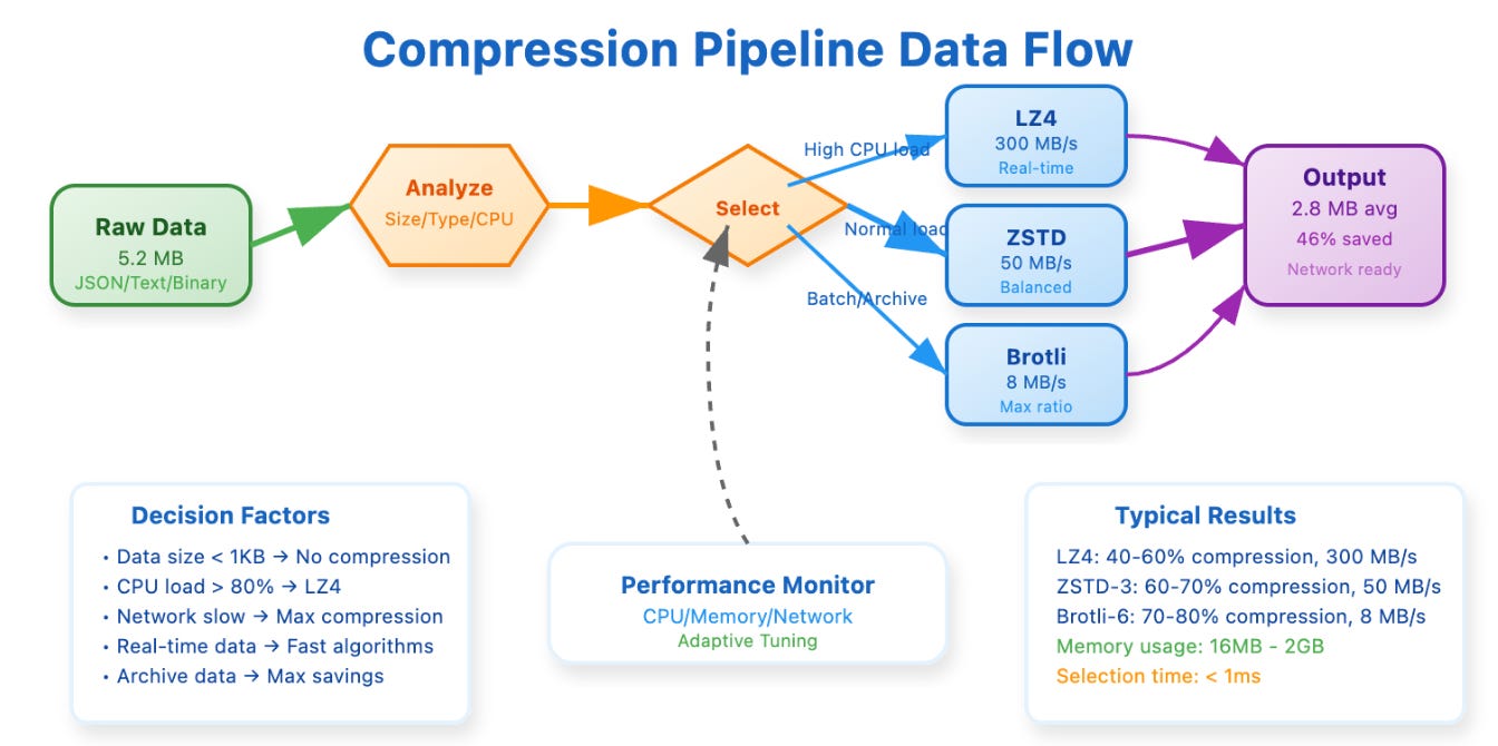 [Compression Pipeline Data Flow showing decision tree and adaptive selection logic]