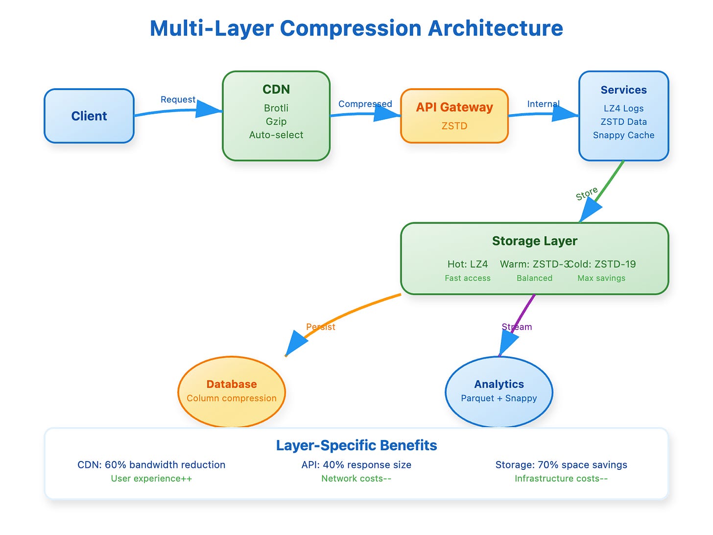 [ Multi-Layer Compression Architecture showing CDN, API Gateway, Storage, and Database layers]