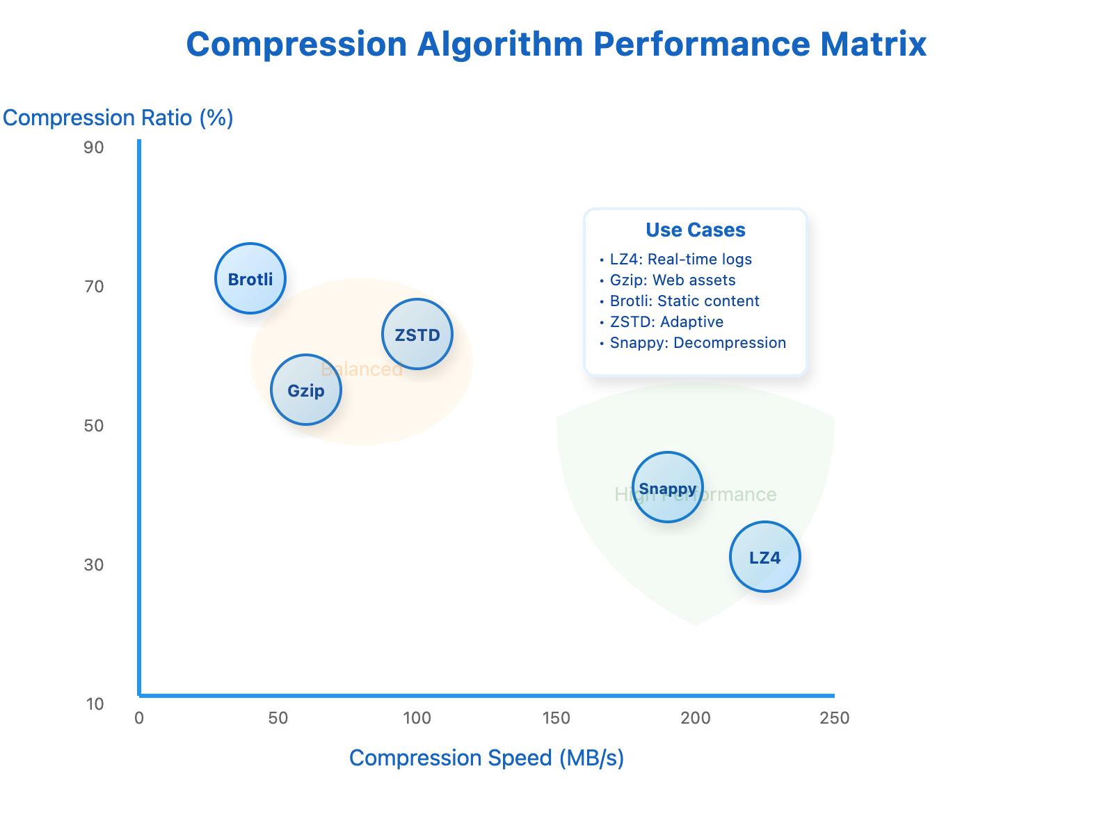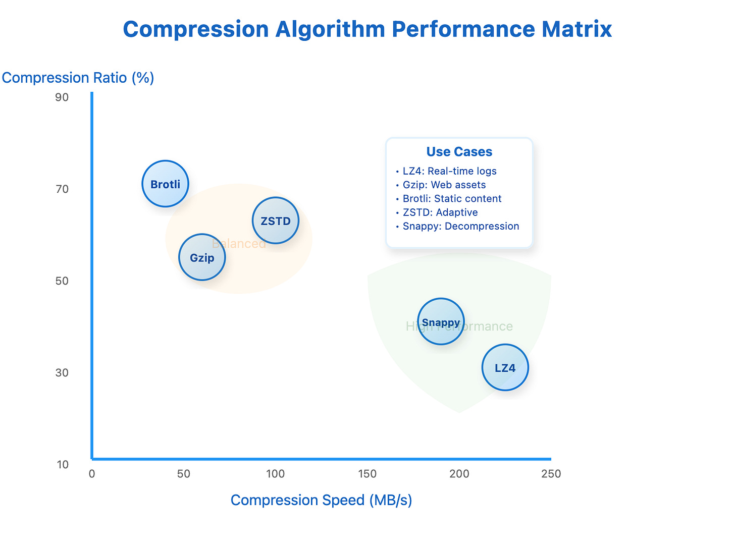 The key is beginning with conservative settings and measuring actual performance impact rather than optimizing based on theoretical characteristics. Implement ZSTD level 3 as a starting point because it provides excellent balance between compression ratio and speed, then tune based on your specific traffic patterns and infrastructure constraints.