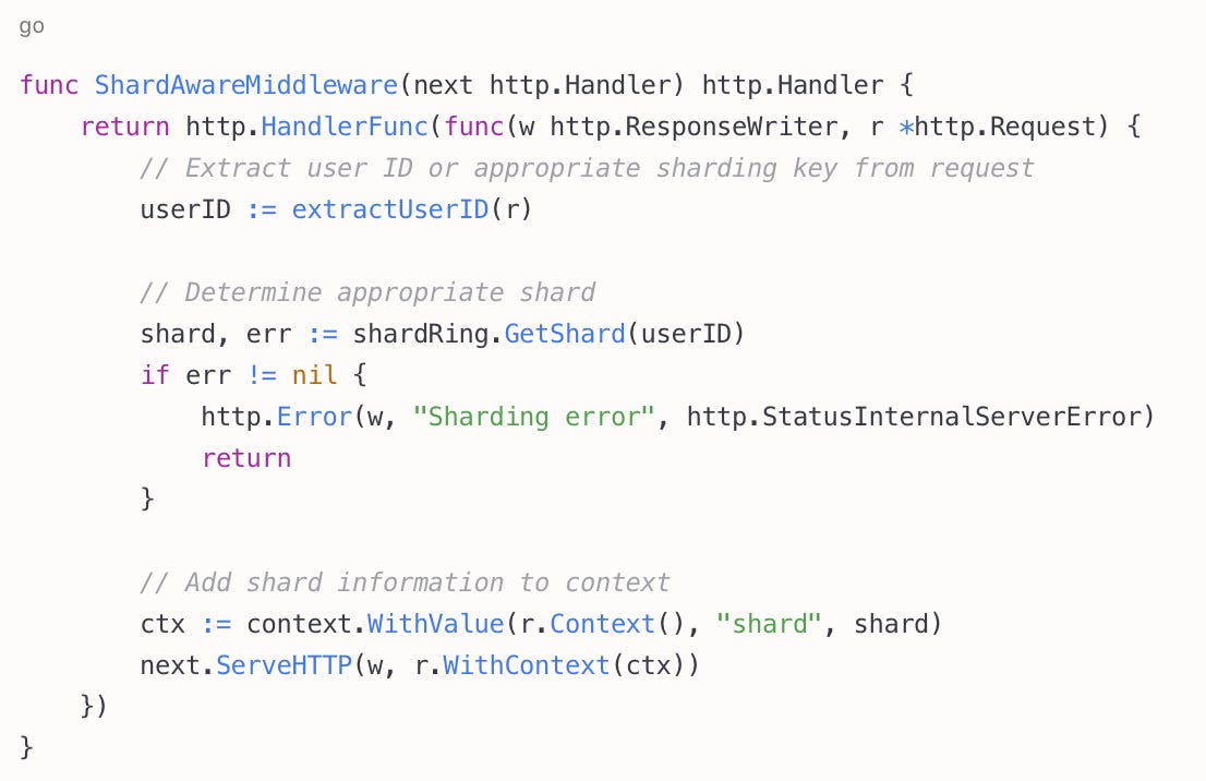 The Go code I provided earlier implements consistent hashing, but how do we integrate it with a real application? Here's the critical piece many engineers miss: application-level routing awareness.