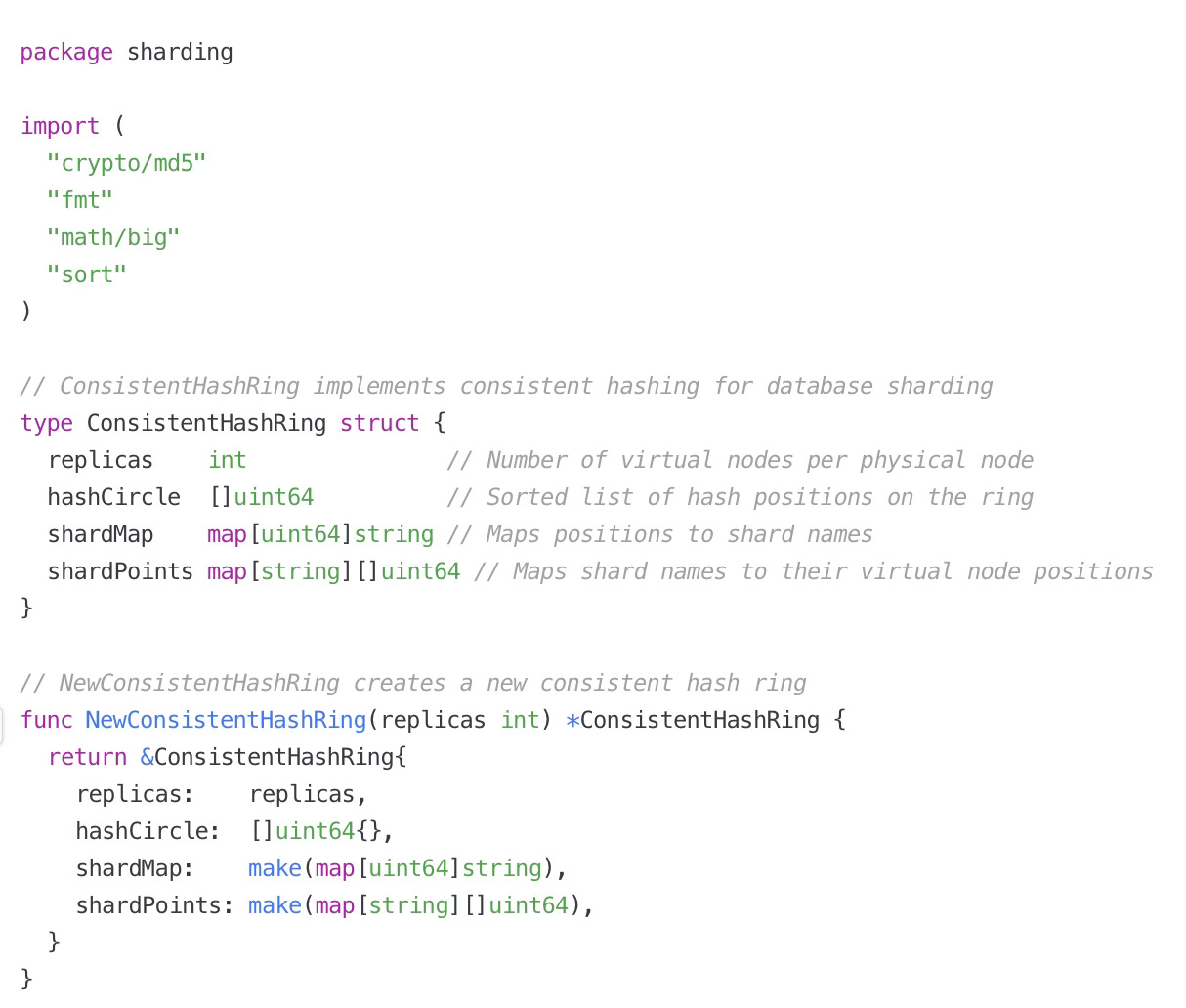 Let's examine a production-ready consistent hashing implementation in Go that handles resharding gracefully: