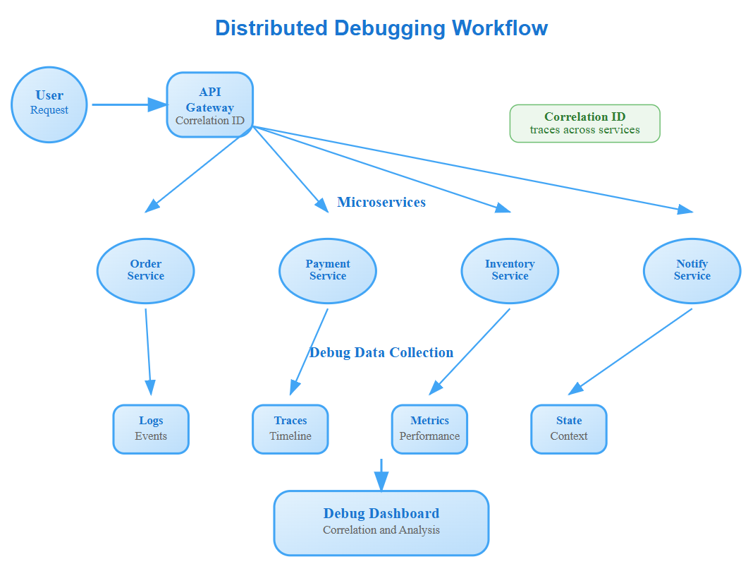 The most underestimated debugging tool is the correlation ID. Unlike traditional debugging where you follow a single thread, distributed systems require following a request's journey across multiple services. But here's the insight most engineers miss: correlation isn't just about request tracing—it's about state correlation.