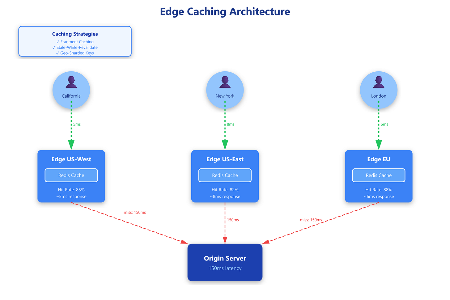The implementation mechanics matter. Edge nodes maintain layered caches: L1 in-memory (microsecond access), L2 on local SSD (millisecond access), L3 at regional aggregation points. A cache miss cascades through layers before hitting the origin. Lambda@Edge or Workers let you inject custom logic—checking user authentication, rewriting cache keys, or collapsing requests when thundering herds slam the same uncached resource.
