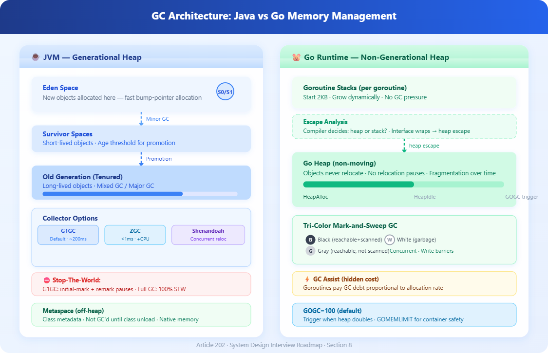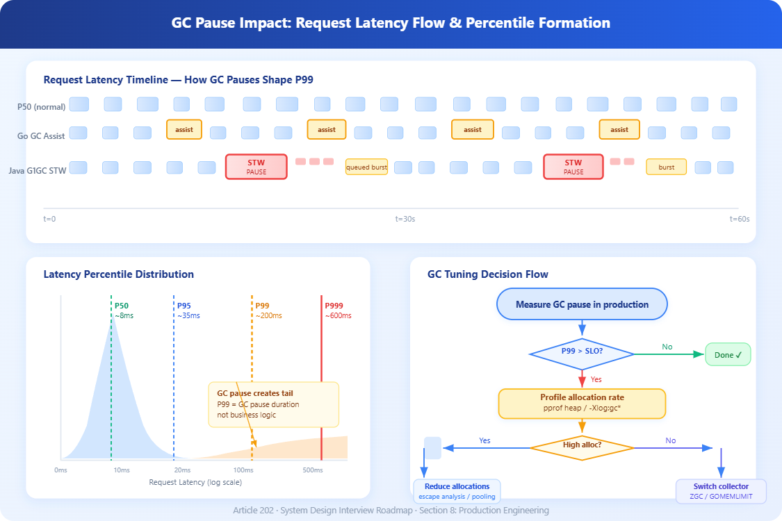 The allocation rate is the root cause behind most GC latency problems. Higher allocation pressure → more frequent collections → more CPU stolen from your application → higher latency. This holds true for both Java and Go, though the symptoms manifest differently.