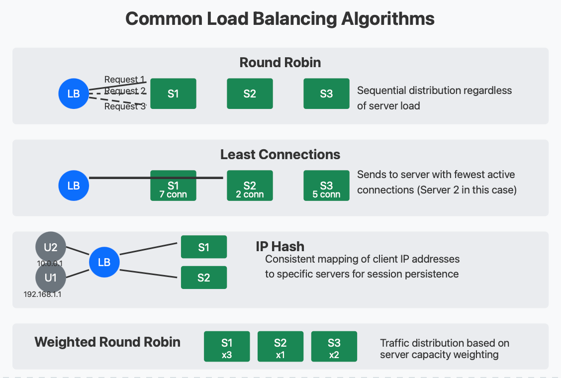 The intelligence of a load balancer lies in its algorithm—the logic it uses to decide which server should handle each incoming request. Let's explore some common algorithms: