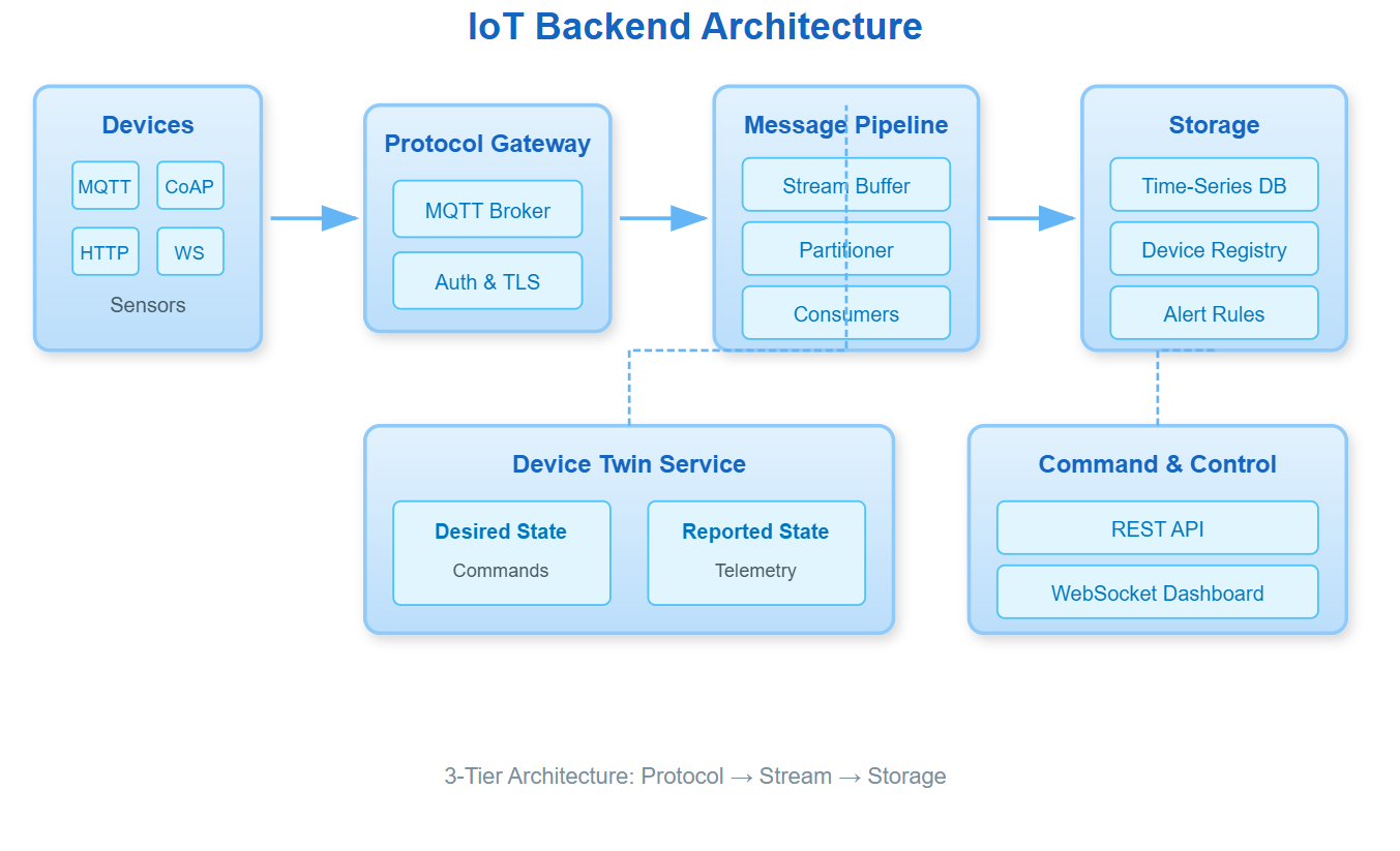 IoT devices speak different protocols—MQTT for low-bandwidth sensors, CoAP for constrained devices, WebSocket for real-time control. Your gateway must translate these into a unified internal format.
