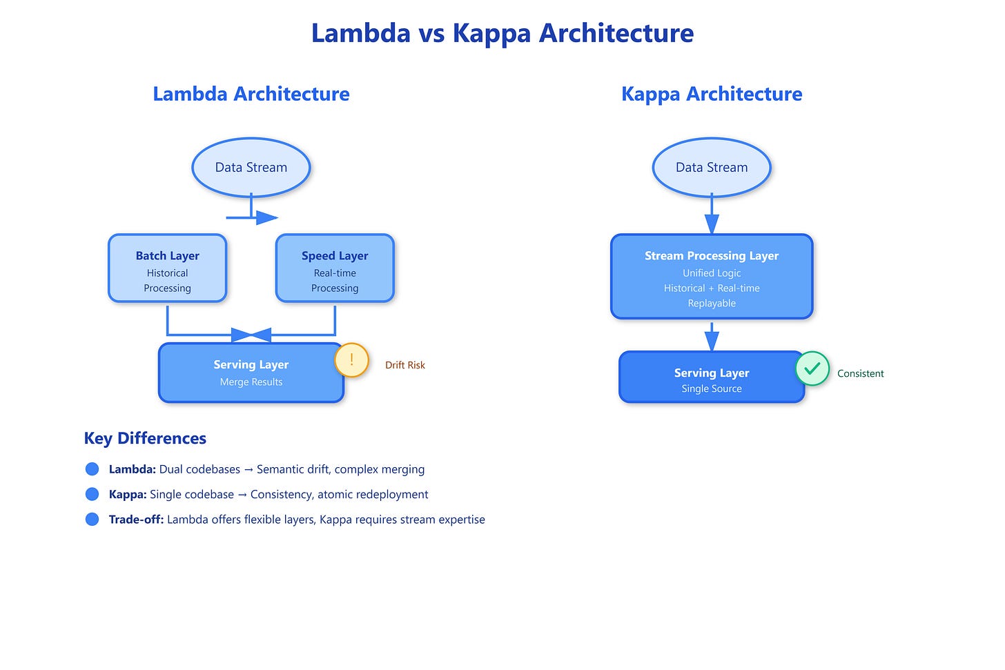 You’re maintaining two completely separate codebases implementing the same business logic. When you change how “active users” is calculated, you update it in both Spark (batch) and Storm/Flink (streaming). They inevitably drift. Your batch layer says 1.2M active users while your speed layer reports 1.18M. Which is right? Both. Neither. It depends on subtle timing and state management differences.