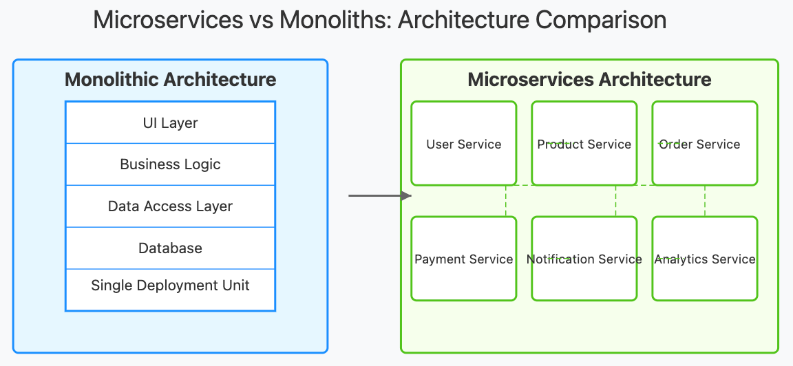 The architectural choice between microservices and monoliths is one of the most fundamental decisions in modern system design. Each approach offers distinct advantages and challenges that significantly impact development workflows, scalability, and maintenance. This guide will explore both architectures in depth, providing visual comparisons and practical decision frameworks.