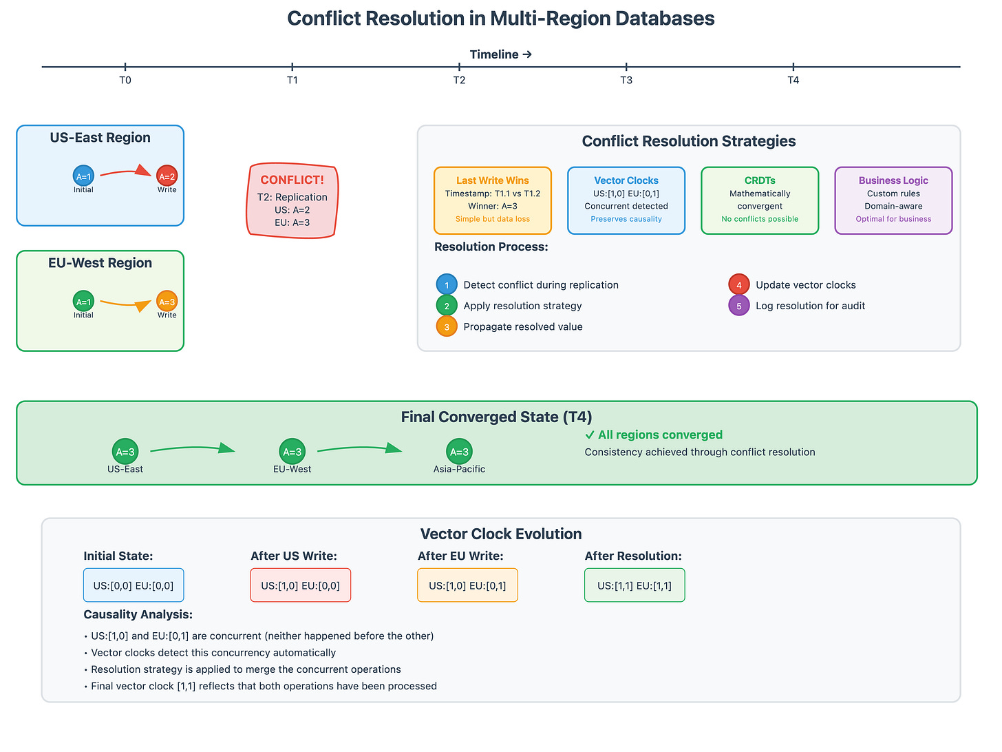 Vector Clocks and Causal Ordering Vector clocks track the causal relationships between operations across regions. When a user updates their profile in one region and then immediately makes a purchase in another region, the vector clock ensures the purchase operation sees the updated profile, even if the regions are temporarily partitioned.