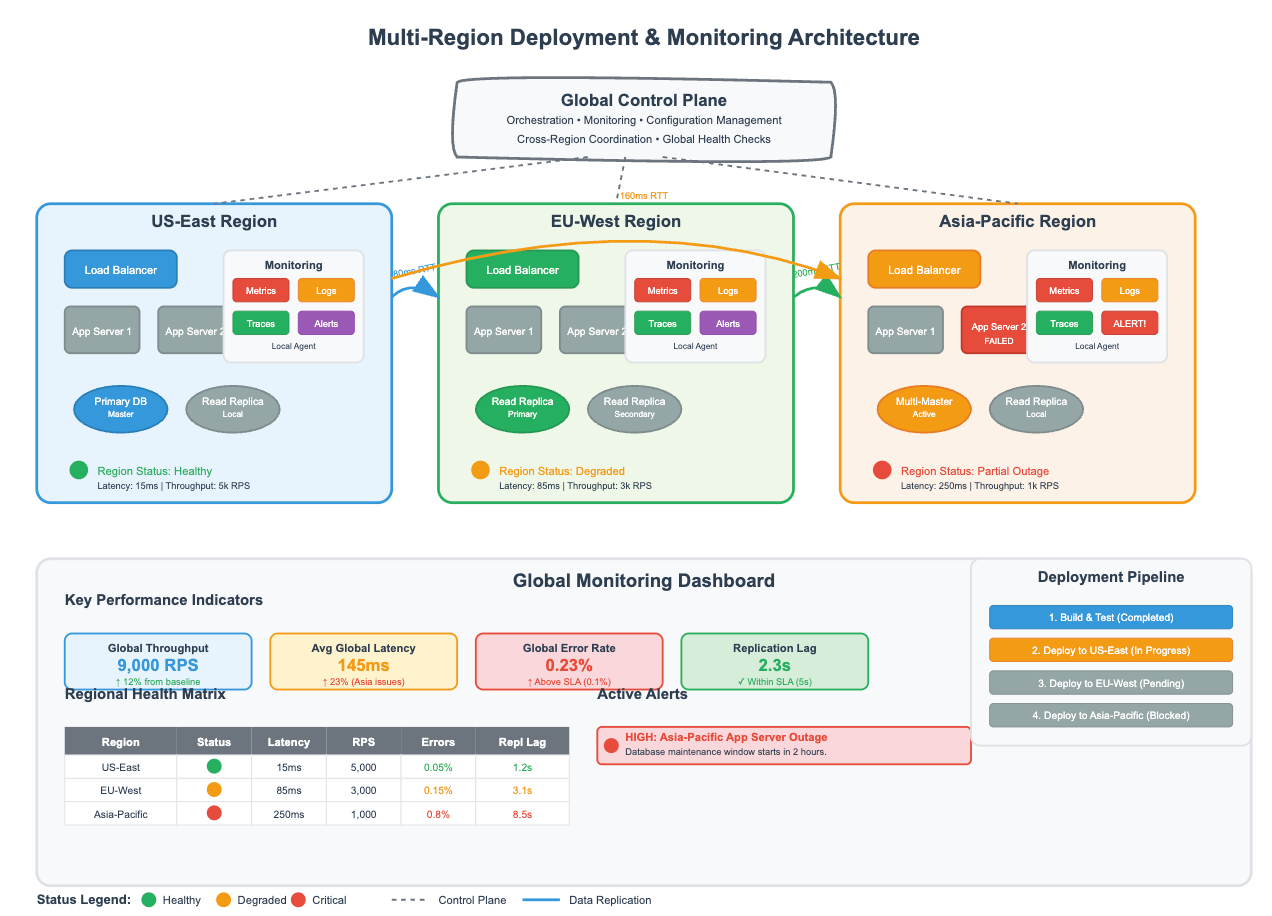 Traditional APM tools struggle with multi-region distributed tracing. Implement trace correlation that can follow a single user request as it fans out across multiple regions and aggregate the results.