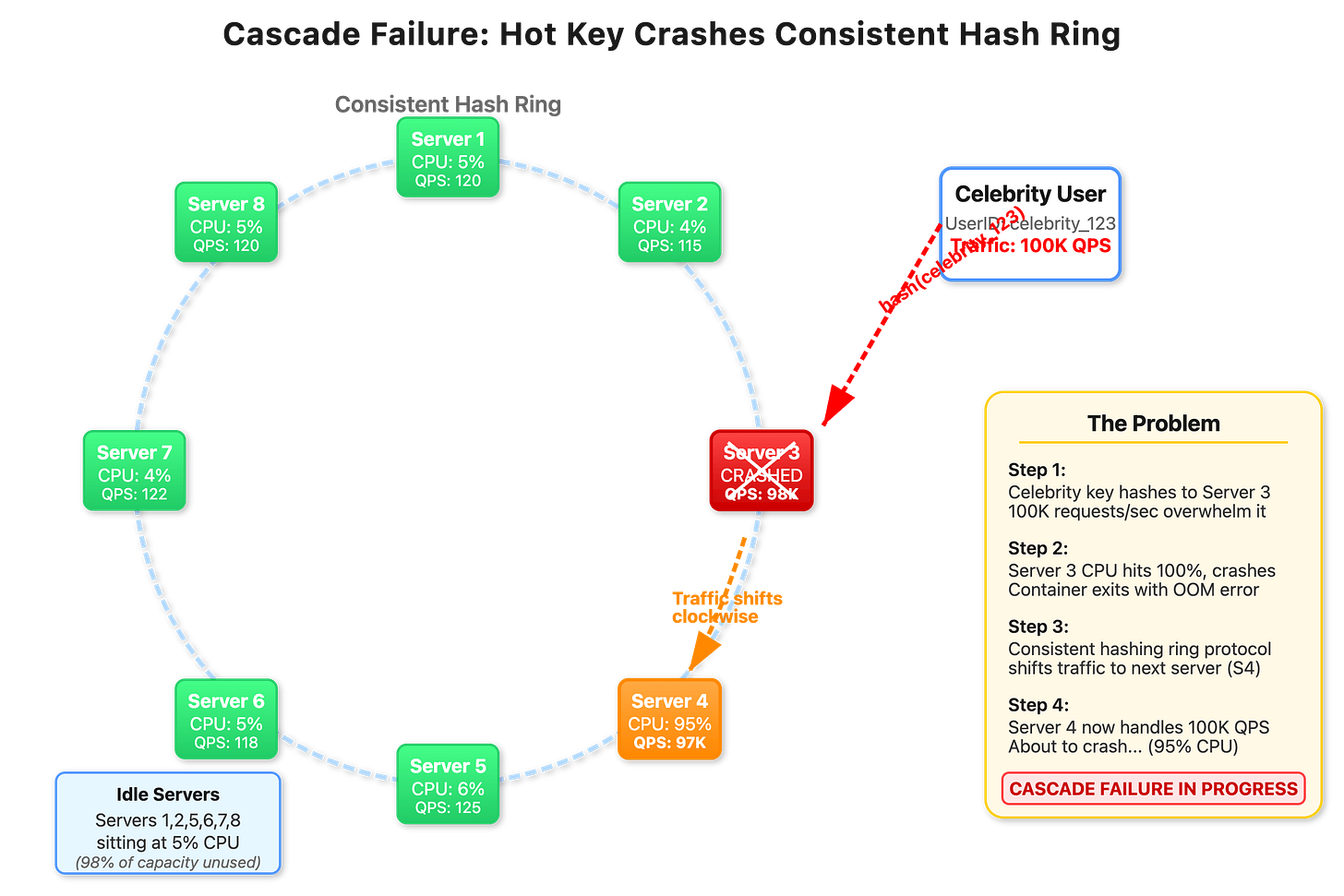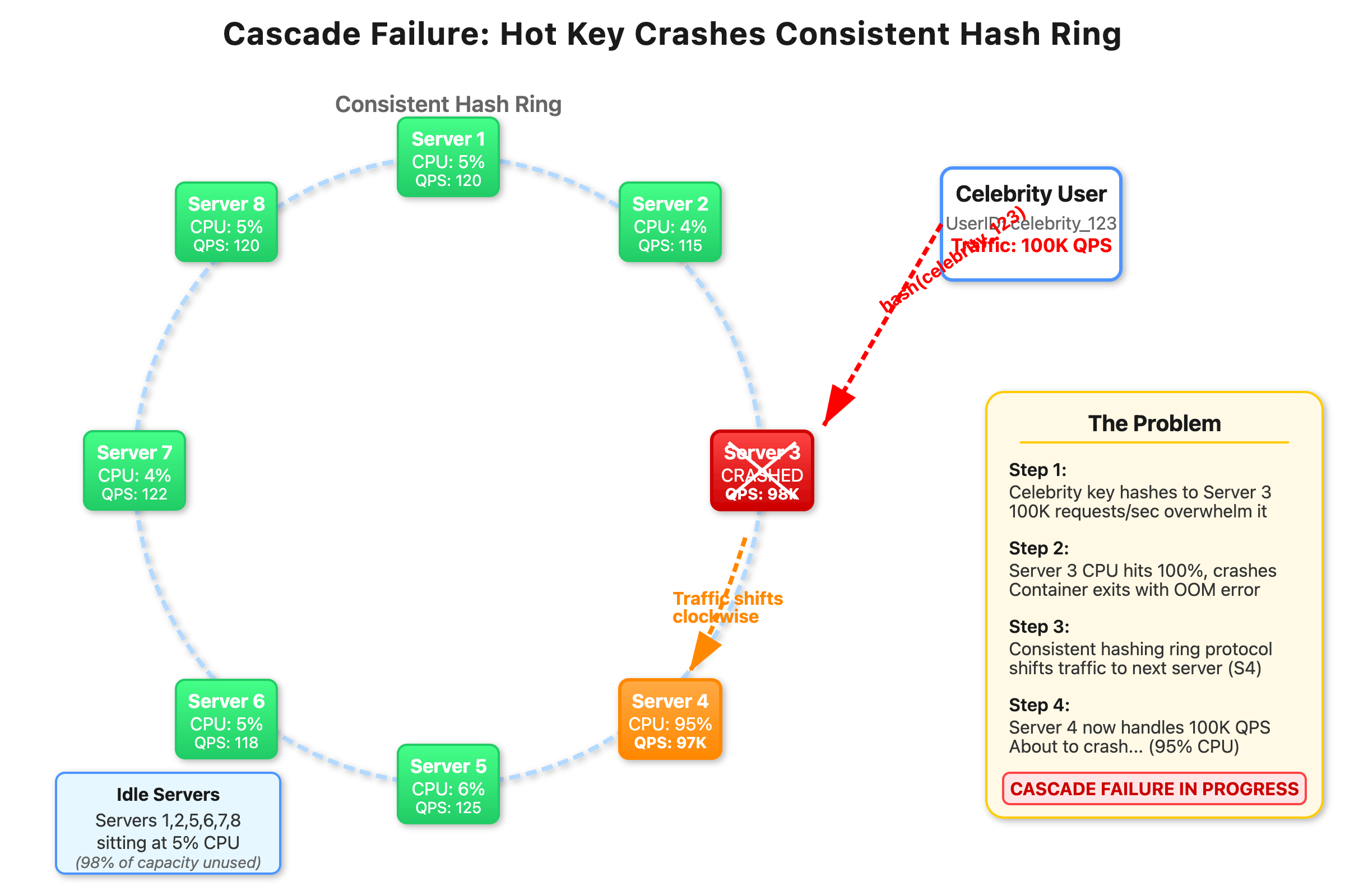 Their assigned server hits 100% CPU and crashes. The hash ring shifts that traffic to the next server—which immediately crashes too. Within minutes, you have lost three servers to a Cascading Failure, while the other 95 servers sit idle at 5% CPU.