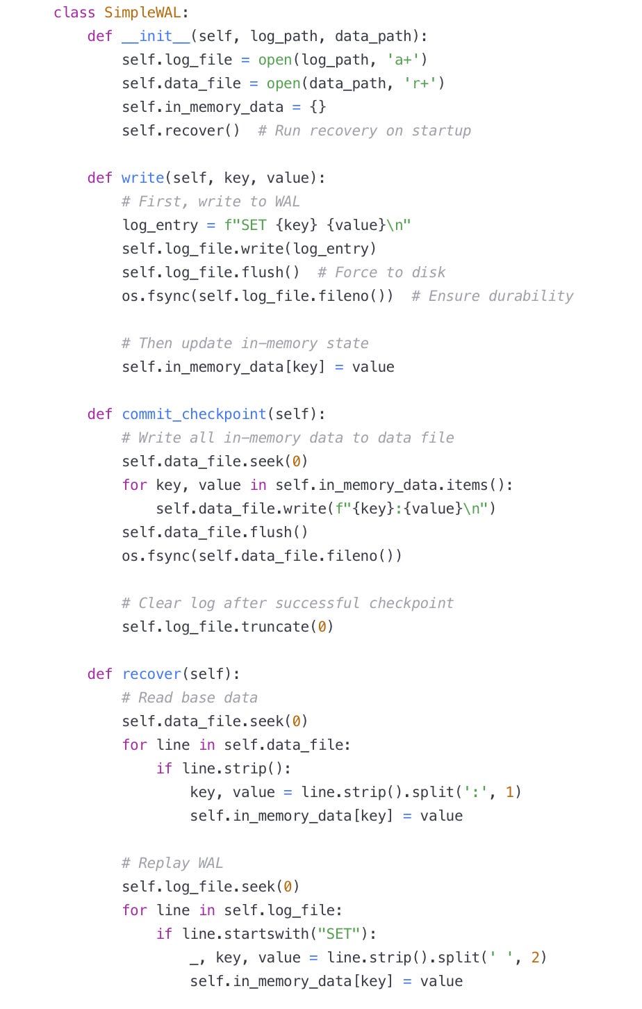 Here's a simplified example of implementing WAL-based recovery in Python: