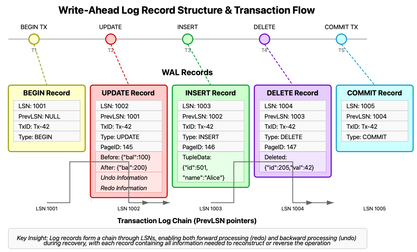 Log Record Creation: When a transaction requests a change (insert, update, delete), the database creates detailed log records containing:
